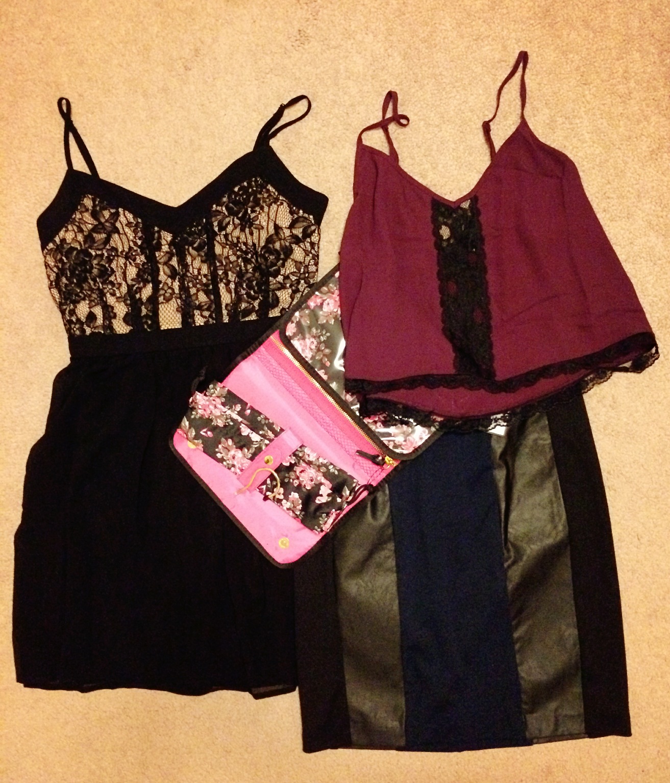 So I think on Monday I went shopping!!! I picked up some goodies that were super cute or a good deal. I mainly went to Forever21 and H&M. I got a cute nude dress with black lace overlay and it is super flowy at the bottom of the dress. The maroon crop top is super cute too because of the little lace strip in the middle as well as at the bottom of the crop. I got a handy organizer that I plan on using as a toiletry bag for camping or a makeup and accessory organizer for when I got on trips. The navy, pleather tight skirt was on sale for super cheap and I figured that I could never go wrong with having formal things in my closet- perfect for those cute dates or professional outtings.